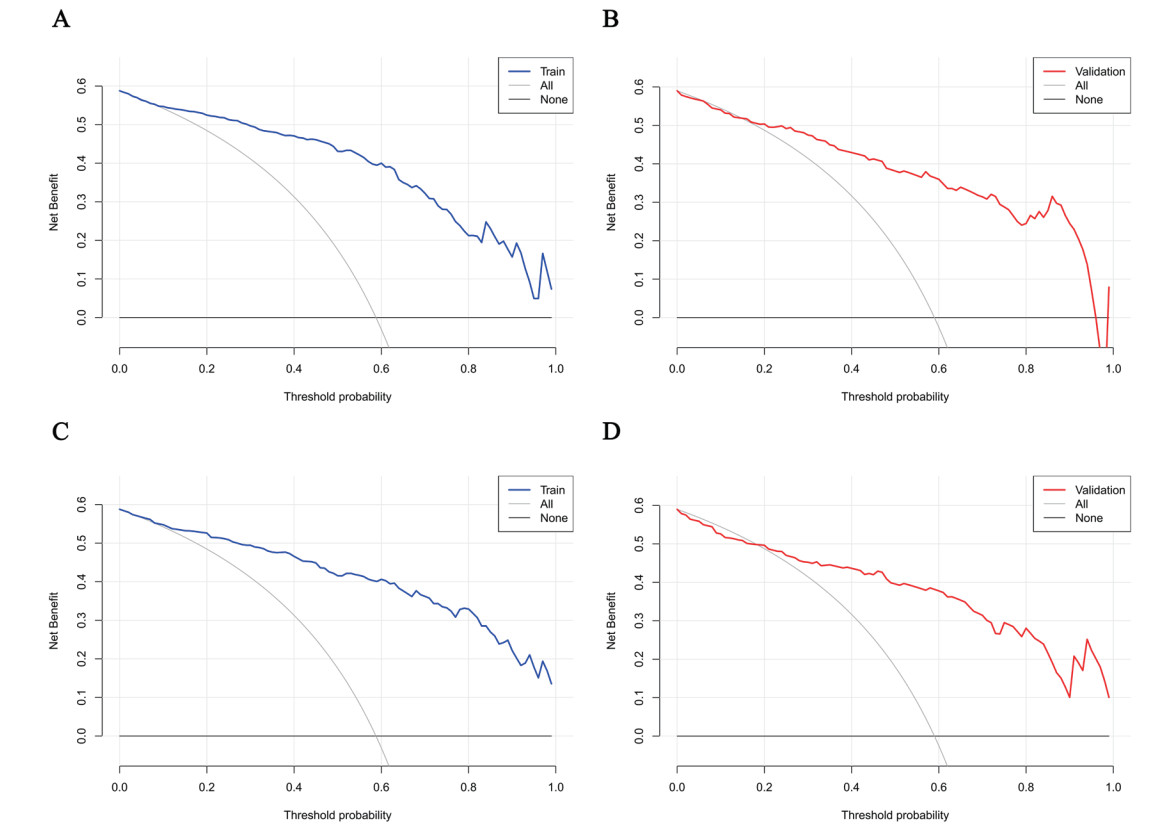 | 注:A为min模型训练集;B为min模型验证集;C为1se模型训练集;D为1se模型验证集;横坐标为阈值概率,纵坐标为净获益 图 5 预测模型的临床决策曲线 Fig 5 DCA of the prediction model |