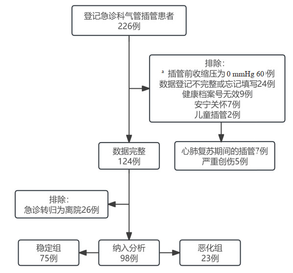 | 注:a其他多种原因出现血压测不出的情况均记录收缩压为0 mmHg 图 1 入组流程图 |