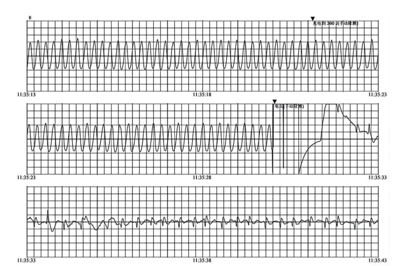 免疫治疗第60天,11:16患者因突发“心脏不适40 min ”拨打急救电话求助。救护车于11:20到达现场,经采集病史和初步评估后立即予以吸氧、建立静脉通道、第一时间全程心电监护,并启程转运。11:33途中患者突发意识丧失,颈动脉搏动消失,心电图示宽QRS心律(图 1),判定为无脉性室速(pulseless ventricular tachycardia, pVT)。急救医生立即给予360 J非同步电除颤一次,成功转复为窦性心动过速,心率150次/min(图 2),患者意识恢复,血压145/103 mmHg,11:38收入急诊抢救室。