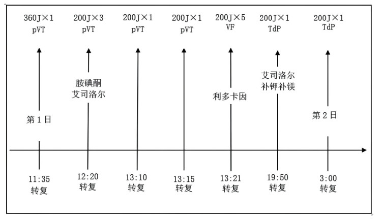 | 注:共记录7次需电复律的恶性室性心律失常事件,包括4次pVT、1次VF和2次TdP,所有事件均复律成功,期间抗心律失常药物方案随事件演进多次调整 图 4 患者24 h内电风暴事件的时间轴 |