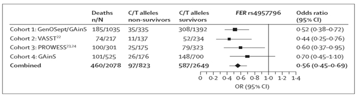 社区获得性肺炎的诊疗中存在大量的风险分层的评分体系及生物学指标。然而,越来越多的证据显示基因组水平的个体差异会显著影响预后,临床评分类似的患者死亡风险可能大相径庭。近期,Rautanen等[25]使用GWAS技术对于基因变异与由社区获得性肺炎引起的脓毒血症的死亡风险之间的关系进行了分析。研究者使用了4个队列研究中的近600个单核酸多态性(SNPs),使用28 d病死率作为终点事件进行分析,结果发现一个位于5号染色体FER基因内含子区的C/T SNP在4个队列中呈现出一致的结果。该位点为CC型者死亡风险为9.5%,TC者为15.2%,TT者则高达25.3%,对死亡风险的预测效能优于临床指标及其组合,见图 1。