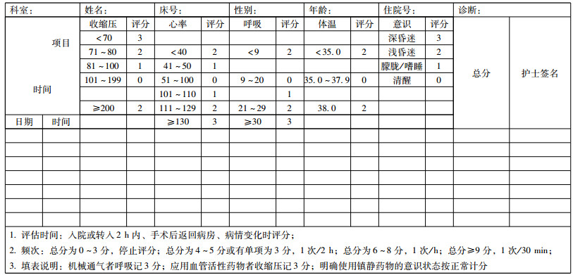 1.2 方法 1.2.1 改良早期预警评分方法评估时间:入院或转入2 h内、手术后返回病房、病情变化时评分;频次:总分为0~3分,停止评分;总分为4~5分或有单项为3分,1次/2 h;总分为6~8分,1次/h;总分≥9分,1次/30 min;机械通气者呼吸记3分;应用血管活性药物者收缩压记3分;明确使用镇静药物的意识状态按正常计分,见图 1。
