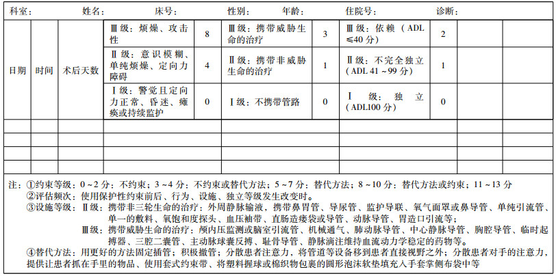 将设施等级分为3给级别:Ⅱ级、Ⅲ级、威胁生命的治疗;评估频次:术后第1天(外科系统)、入院后2 h(内科系统);转入后2 h;行为、设施、独立等级发生改变时。替代方法:用更好的方法固定插管;积极撤管;分散患者注意力,将管道等设备移到患者直接视野之外;分散患者对手的注意力,提供让患者抓在手里的物品、使用套式约束带、将塑料握球或棉织物包裹的圆形泡沫软垫填充入手套掌侧布袋中。约束等级:按目前采取措施记录,不记录总分,以作为目前现状调查及各条目分值修订的参考,见图 2。