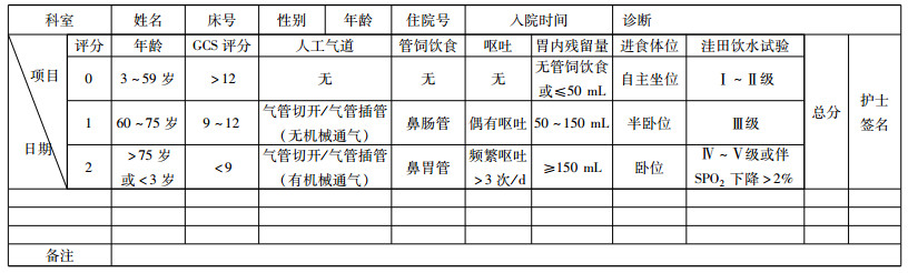 注:①饮水试验适用神经系统疾病及年龄≥60岁的住院患者;②饮水试验判断标准:坐位或半坐位状态下饮30 mL温水,Ⅰ级为5 s内能顺利地一次性咽下;Ⅱ级需要分2次或需要5 s以上饮完;Ⅲ级能一次咽下,伴有呛咳;Ⅳ级为2次以上咽下,伴有呛咳;Ⅴ级为屡屡呛咳,难以全景咽下;③患者入院时即进行首次评估,将各个项目的得分相加即得到总分,总分<6分为低危患者,6~12分为中危患者,>12分为高危患者。总分≥6分者需采取防误吸护理措施,并72 h评估1次;非高危患者每周评估1次,患者状态发生改变时,应再评估 图 3 误吸评估登记表 Figure 3 Aspiration assess registration form |