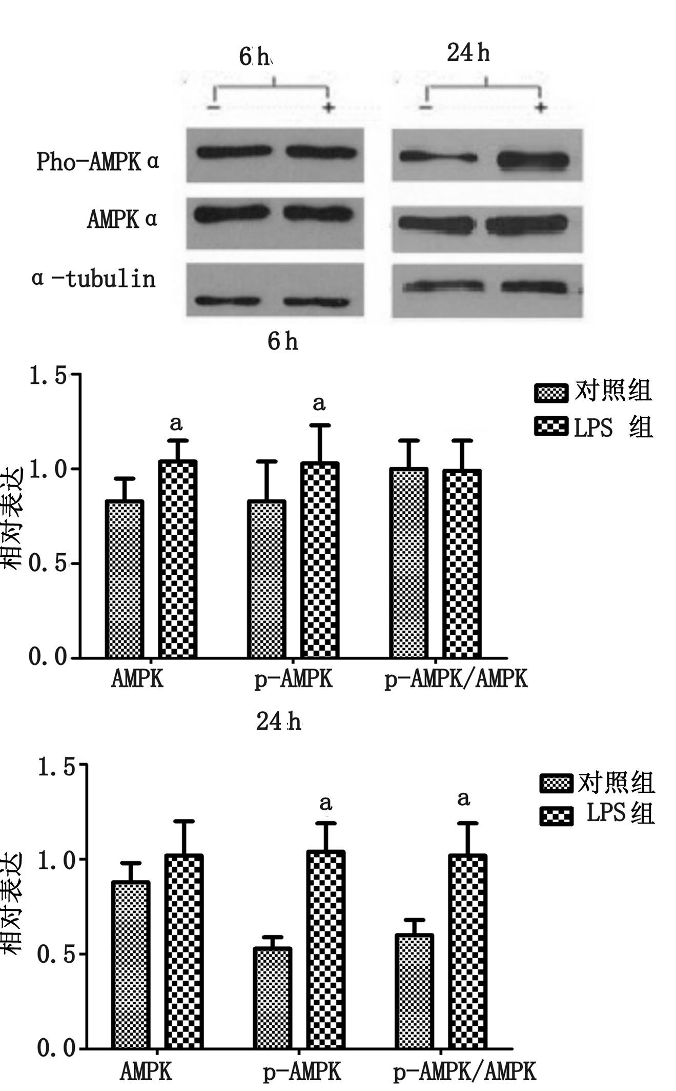 | —:对照组;+:实验组;Pho-AMPKα:磷酸化AMP激活的蛋白激酶α;AMPKα:AMP激活的蛋白激酶α;a-tublin:内参;与对照组比较,aP<0.05 图 3 注射LPS后6 h、24 h,大鼠肝脏组织中AMPK、p-AMPK、p-AMPK/AMPK的变化和Western blot表达 |