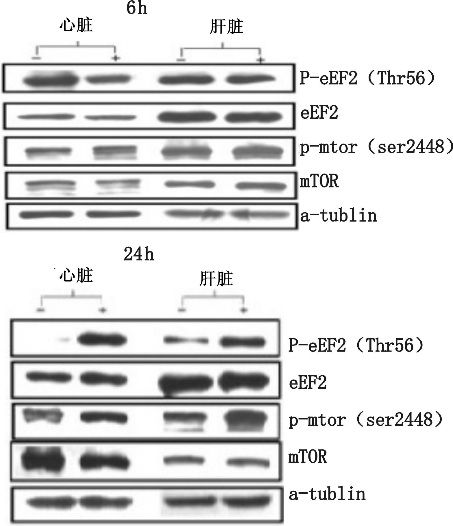 | —:对照组;+:实验组;eEF2:延伸因子2;p-eEF2(Thr56):磷酸化延伸因子2;mTOR:哺乳类动物雷帕霉素靶蛋白;p-mTOR(ser2448):磷酸化哺乳类动物雷帕霉素靶蛋白;a-tublin:内参 图 4 注射LPS 6 h,24 h后各蛋白的表达 |