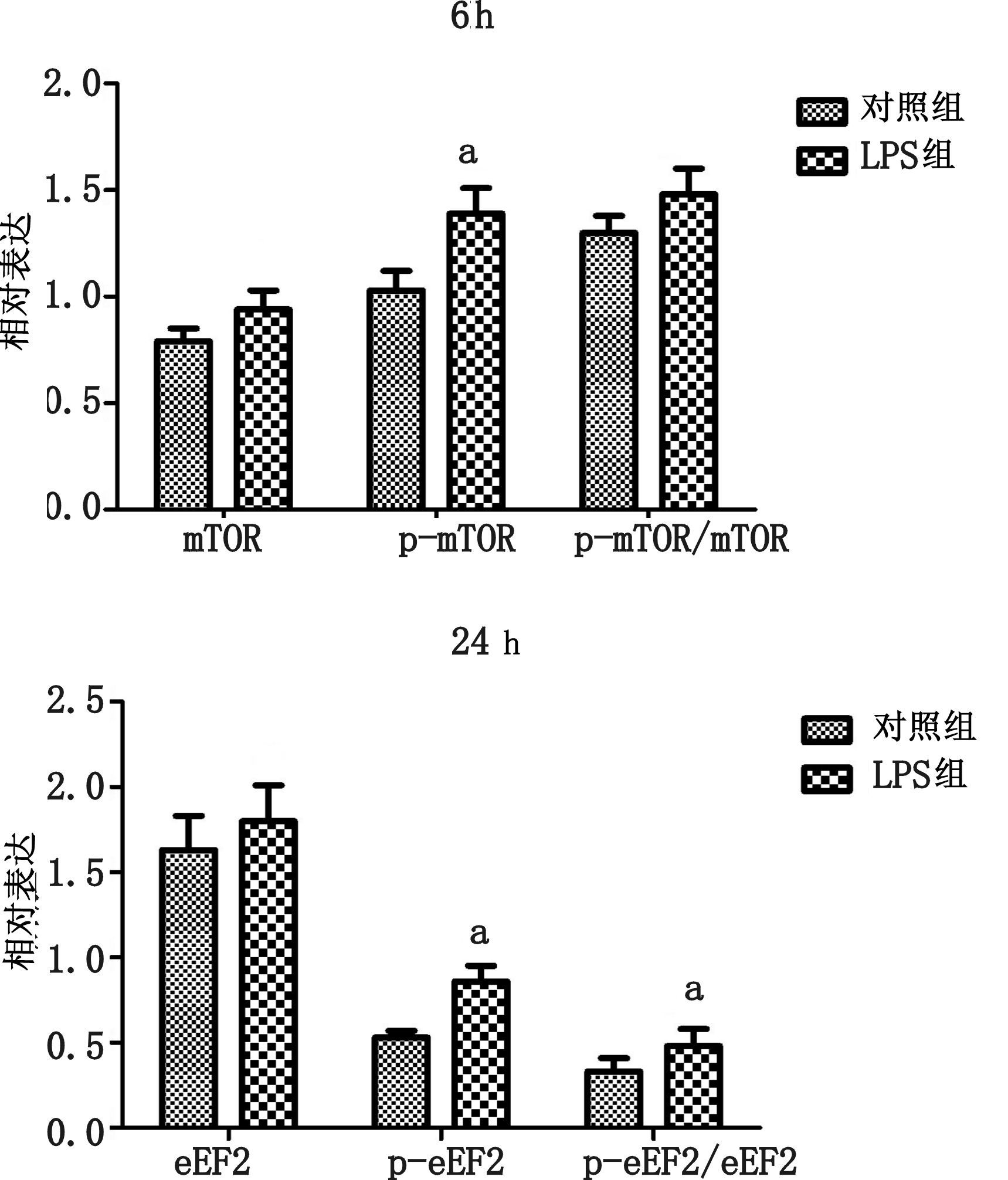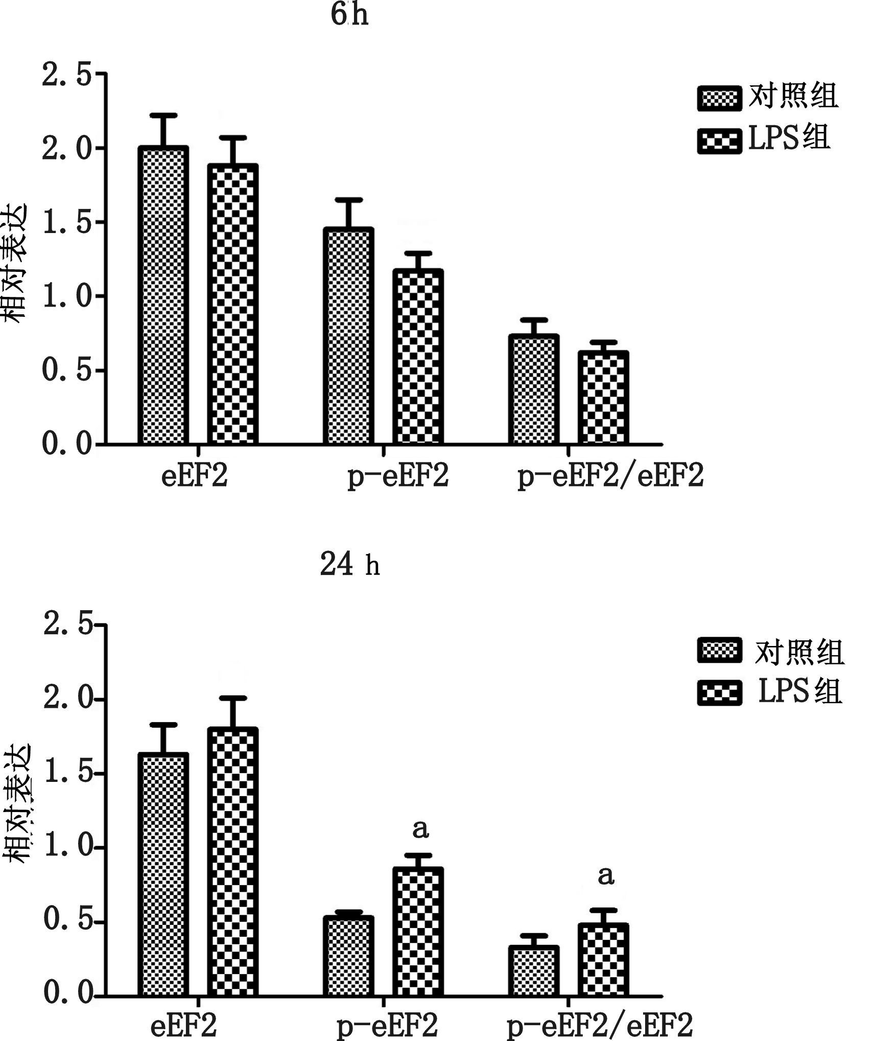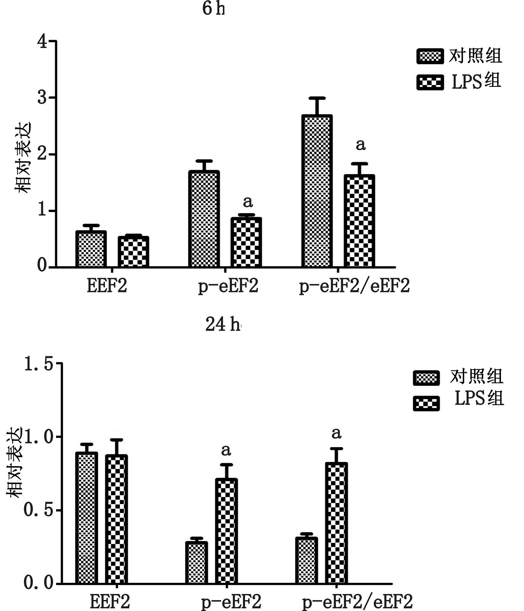 | 与对照组比较,aP<0.05 图 6 注射LPS6 h,24 h后,肝脏组织中eEF2、p-eEF2(Thr56)以及p-eEF2(Thr56)/eEF2比例的变化 |