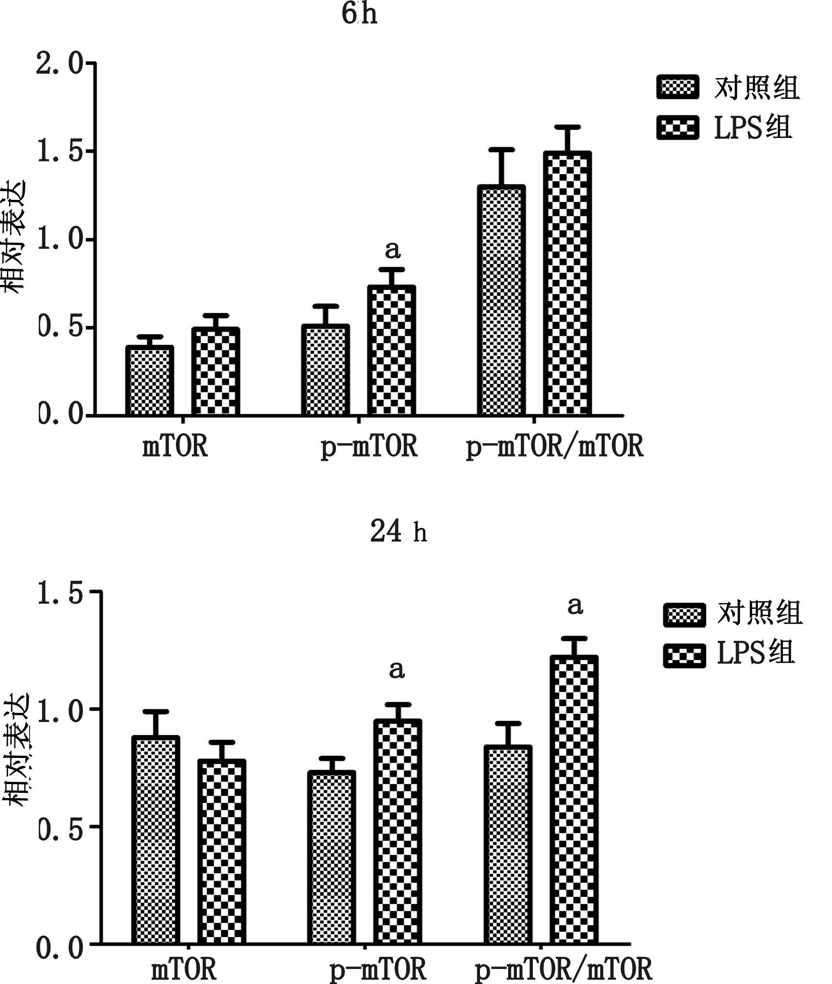 | 与对照组比较,aP<0.05 图 8 注射LPS6 h,24 h后,肝脏组织中mTOR、p-mTOR(ser2448)以及p-mTOR(ser2448)/mTOR比例的变化 |