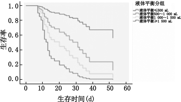 2.5 严重脓毒症性AKI患者的COX回归分析液体平衡>500 mL是影响严重脓毒症AKI患者预后的独立危险因素,CRRT治疗是影响严重脓毒症AKI患者预后的保护性因素,见表 2。将液体平衡的平均值分为不同的等级,分别为液体平衡≤500 mL、500~1 000 mL、1 000~1 500 mL、≥1 500 mL,Kaplan-Meier生存曲线显示,随着液体正平衡量越大,严重脓毒症AKI患者的生存时间越短,预后越差,见图 1。