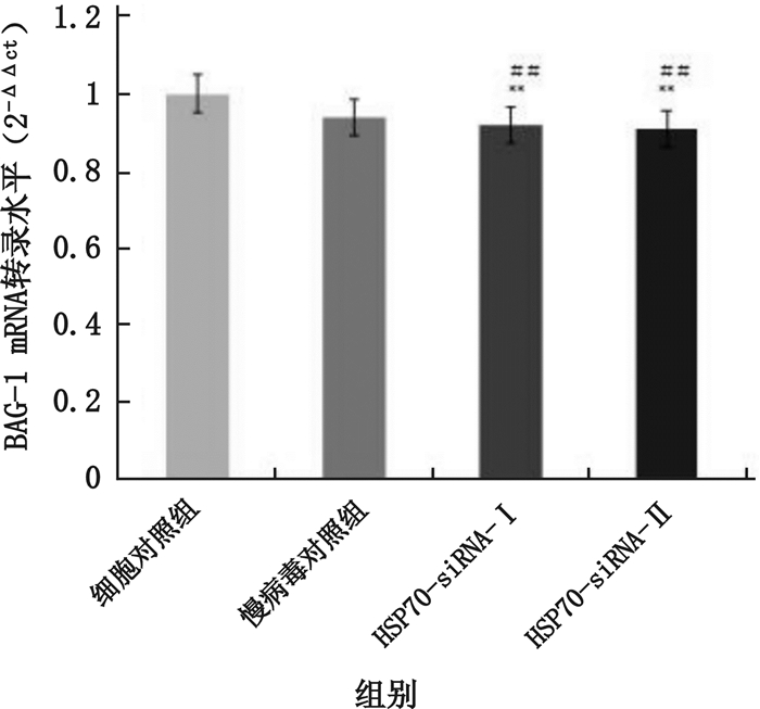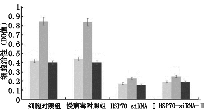 1 材料与方法 1.1 细胞培养及靶细胞转染细胞于含10%胎牛血清,100 U/mL青霉素、100 μg/mL链霉素的培养基中,置37 ℃、5%CO2培养箱培养。实验分4组,细胞对照组(正常SH-SY5Y细胞)、慢病毒对照组(感染携带GFP编码基因但不含siRNA编码序列的慢病毒)、HSP70-siRNA-Ⅰ感染组(感染携带GFP编码基因及siRNA-Ⅰ编码序列的慢病毒)、HSP70-siRNA-Ⅱ感染组(感染携带GFP编码基因及siRNA-Ⅱ编码序列的慢病毒)。转染前24 h将细胞接种于24孔板中,待细胞汇合度达70%~80%时,按慢病毒操作手册转染细胞。10 h后更换正常培养基,72 h后用嘌呤霉素筛选细胞,得到稳定表达siRNA的细胞系。