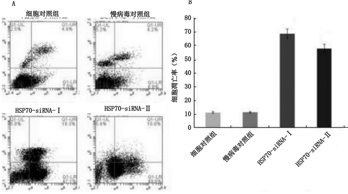 | 缺氧8 h复氧24 h,慢病毒感染组细胞凋亡增加(A),与细胞对照组相比,aP<0.05,与慢病毒对照组相比,bP<0.05 图 3 HSP70沉默对缺氧状态下细胞凋亡的影响 |