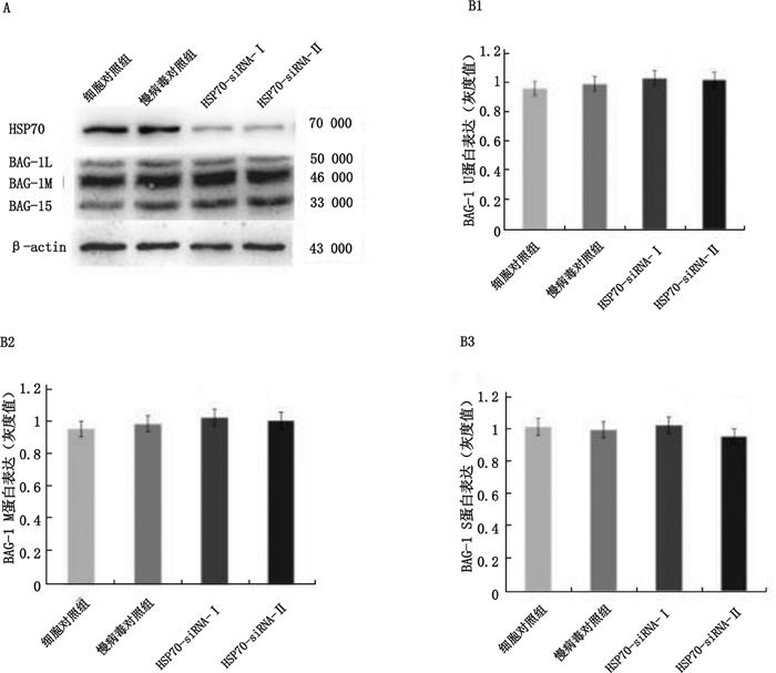 | 与细胞对照组相比,aP>0.05,与慢病毒对照组相比,bP>0.05 图 4 HSP70沉默对缺氧细胞BAG-1蛋白表达水平的影响 |