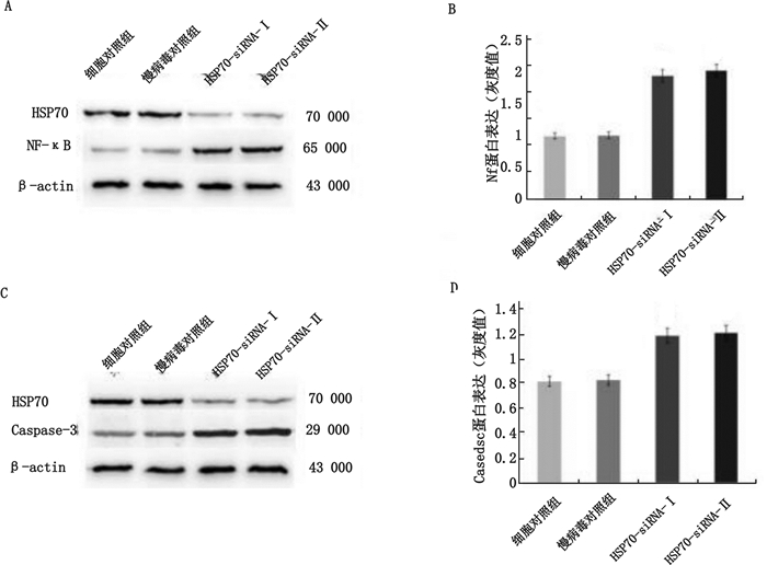 | 与细胞对照组相比,aP < 0.05,与慢病毒对照组相比,bP < 0.05 图 5 HSP70沉默对缺氧细胞Caspase-3、NF-κB蛋白表达的影响 |