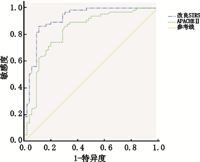 图 1 改良SIRS与APACHE Ⅱ预测SAP的ROC曲线 |