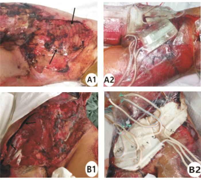 A1:病例1术后第7天创面,箭头所指为强生超普网片;A2:病例1术后第3天更换VSD前;B1:病例2术后第3天创面情况,箭头所指为深、大的创面间隙;B2:病例2术后第3天更换VSD后 图 1 2例患者的术前术后对比 |
