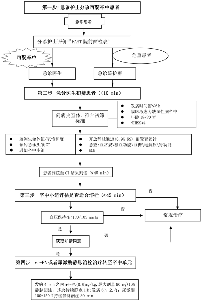 4 缩短院内延误目前美国心脏协会/美国卒中协会指南倡导从急诊就诊到开始溶栓(door-to-needle time, DNT)应争取在60 min内完成[3]。这就需要急诊科溶栓绿色通道各个环节密切配合、统筹安排工作和时间,最大限度缩短确定溶栓的时间,在溶栓时间窗内尽早应用rt-PA。如果没有rt-PA或因医保和经济原因,亦可以选择尿激酶溶栓治疗,以减少患者的神经功能损失。