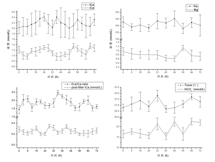 RCA组患者行CRRT期间(图 5),体内血电解质和体温基本维持在正常生理范围,血总钙2.22 (1.82~2.54) mmol/L,血离子钙1.18 (1.11~1.28) mmol/L,血钠142.3 (139.4~144.1) mmol/L,血镁0.83 (0.75~0.94) mmol/L,血碳酸氢根17.1 (15.8~17.9) mmol/L,核心温度37.2 (36.9~37.5) ℃。滤器后血离子钙水平也在目标范围0.26 (0.24~0.28) mmol/L;未发现有枸橼酸蓄积现象,血总钙/离子钙1.9 (1.7~2.1)。