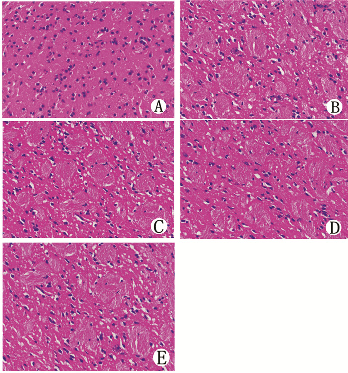 A: Sham组; B: I/R组; C: Atip组; D: DEX组; E: DA组 图 1 光镜下各组脑组织形态学变化(HE×200) Figure 1 The histological changes of brain tissue in each group(HE×200)