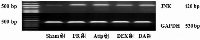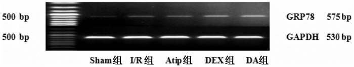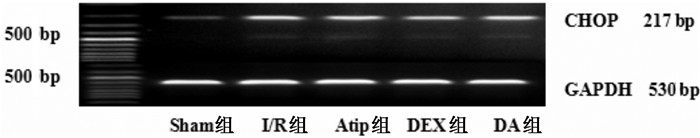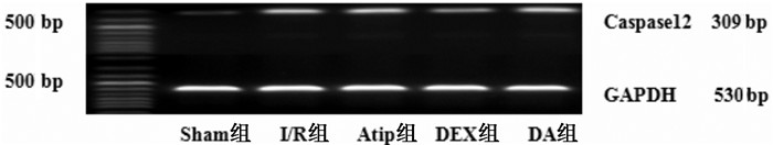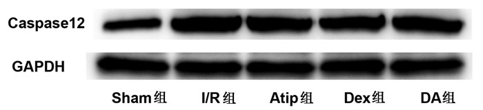 与Sham组比较,其余各组JNK、Caspase12、CHOP、GRP78 mRNA水平均明显升高(P<0.01);I/R组、Atip组及DA组的mRNA水平两两比较,JNK、Caspase12、CHOP mRNA水平均差异无统计学意义(P>0.05),GRP78 mRNA水平DA组明显升高(P<0.01);DEX组与I/R组比较,JNK、Caspase12、CHOP mRNA水平呈显著下降趋势(P<0.01),GRP78 mRNA水平明显升高(P<0.01);DA组与DEX组比较,JNK、Caspase12、CHOP mRNA水平明显升高(P<0.01),GRP78 mRNA水平比较差异无统计学意义(P>0.05)。见表 2图 9~12