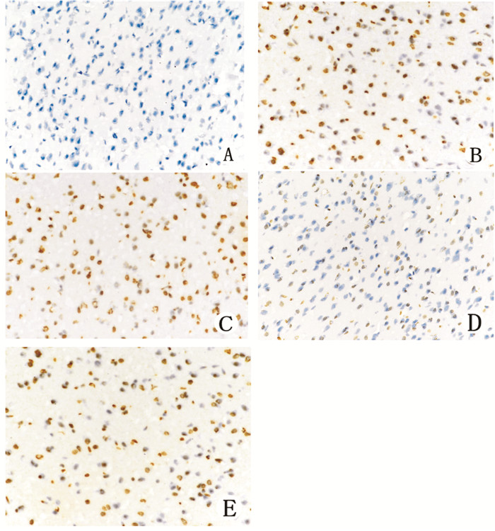 A: Sham组; B: I/R组; C: Atip组; D: DEX组; E: DA组 图 2 脑细胞凋亡TUNEL图(×400) Figure 2 The TUNEL staining results of brain cell apoptosis in each group(×400)