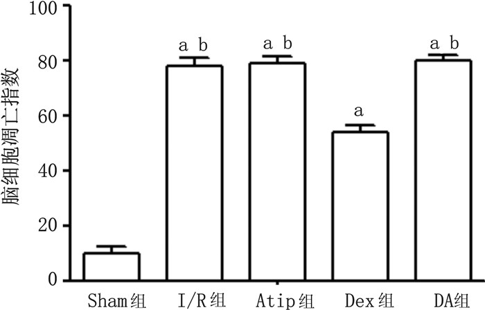 与Sham组比较,aP<0.01;与DEX组比较,bP<0.01 图 3 各组脑细胞凋亡指数 Figure 3 The apoptosis index of brain cell in each group