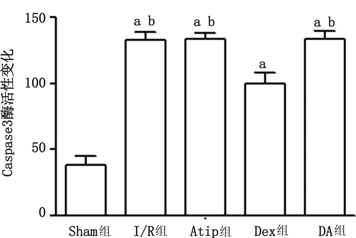 与Sham组(38.51±6.92)比较,其余各组Caspase3酶活性均明显升高(P<0.01),DEX组(99.53±8.81)与I/R(132.81±6.00)、Atip(133.46±4.77)和DA组(133.53±6.25)比较,Caspase3酶活性呈现明显下降趋势(P<0.01),I/R组、Atip组和DA组两两比较,差异均无统计学意义(P>0.05)。见图 4