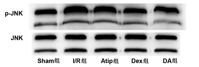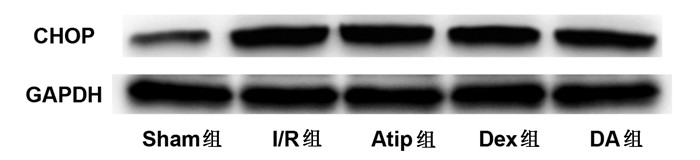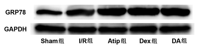 与Sham组比较,其余各组p-JNK、Caspase12、CHOP、GRP78蛋白水平均明显升高(P<0.01);I/R组、Atip组和DA组两两比较,p-JNK、Caspase12、CHOP水平均差异无统计学意义(P>0.05),GRP78水平DA组明显升高(P<0.01);DEX组与I/R组比较,p-JNK、Caspase12、CHOP蛋白水平均明显下降(P<0.01),GRP78蛋白水平明显升高(P<0.01);DA组与DEX组比较,p-JNK、Caspase12、CHOP蛋白水平明显升高(P<0.01),GRP78蛋白水平比较差异无统计学意义(P>0.05)。见图 5~8表 1