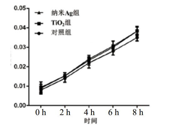 注:在相应时间点,纳米Ag组和TiO2组分别与对照组相比aP > 0.05。 |