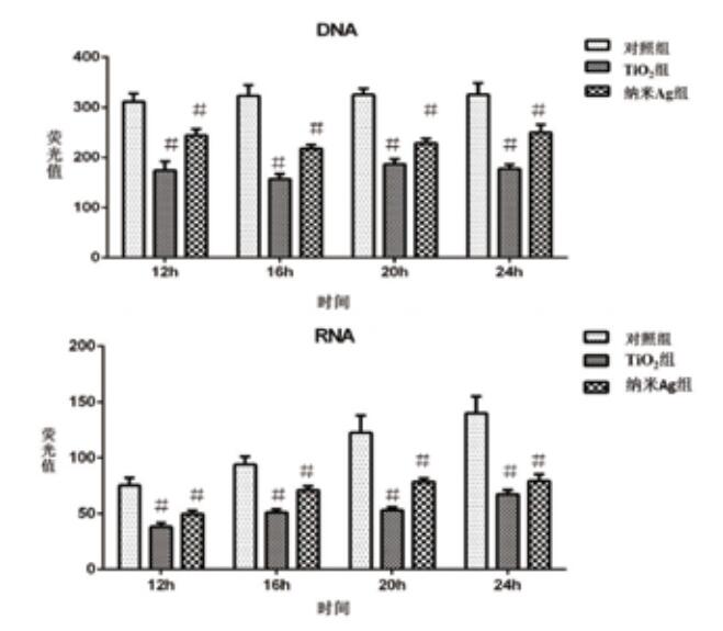 图 2 纳米Ag和TiO2作用金黄色葡萄球菌后菌体内DNA、RNA荧光值 Figure 2 DNA and RNA content of staphylococcus aureus treated with nano Ag and TiO2 |