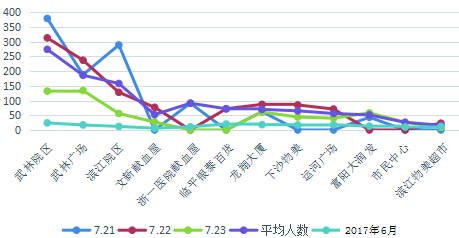 “7·21”爆炸事故街头献血点3 d平均采集人数与2017年6月日平均采集人数比较显示(图 3),血液中心本部二个院区和主城区中心地段的武林广场献血点献血人数增长10倍以上,其次文新献血屋和浙一医院献血屋增长8倍以上。