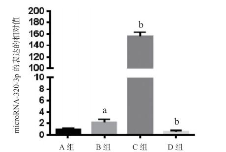 A: Sham假手术组; B: MCAO/R大脑中动脉缺血-再灌注组; C: MCAO/R+miRNA-320拟似物组;D: MCAO/R+miRNA-320抑制剂组; 与A组比较,aP < 0.05;与B组比较,bP < 0.05 图 1 各处理组中microRNA-320-3p的表达情况 |