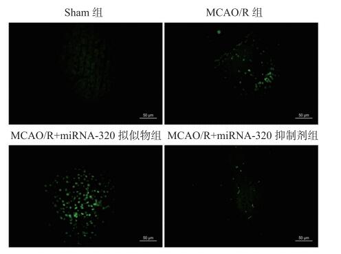 与假手术组比较,MCAO/R小鼠梗死区周边细胞凋亡明显增加,miRNA-320拟似物处理进一步加剧脑缺血小鼠皮层梗死周边区细胞凋亡水平,miRNA-320抑制剂处理降低脑缺血小鼠皮层梗死周边区细胞凋亡水平。见图 2。