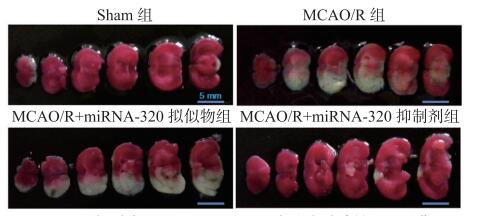 Sham组:假手术组; MCAO/R组:大脑中动脉缺血-再灌注组 图 3 小鼠脑切片后TTC染色结果例图 |