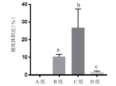 A: Sham假手术组; B: MCAO/R大脑中动脉缺血-再灌注组; C: MCAO/R+miRNA-320拟似物组; D: MCAO/R+miRNA-320抑制剂组; 与A组比较,aP < 0.05;与B组比较,bP < 0.05,cP < 0.01 图 4 各组脑组织梗死体积比较 |