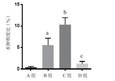 A: Sham假手术组; B: MCAO/R大脑中动脉缺血-再灌注组; C: MCAO/R+miRNA-320拟似物组; D: MCAO/R+miRNA-320抑制剂组; 与A组比较,aP < 0.05;与B组比较,bP < 0.05 图 5 各组脑组织水肿程度比较 |