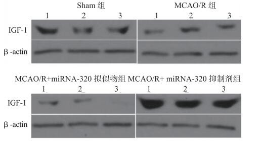 Sham组:假手术组;MCAO/R组:大脑中动脉缺血-再灌注组 图 7 miRNA-320抑制MCAO / R小鼠损伤侧皮质IGF-1蛋白水平 |