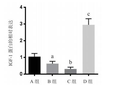 A: Sham假手术组; B: MCAO/R大脑中动脉缺血-再灌注组; C: MCAO/R+miRNA-320拟似物组;D: MCAO/R+miRNA-320抑制剂组; 与A组比较,aP < 0.05;与B组比较,bP < 0.05,cP < 0.01 图 8 小鼠损伤皮质侧IGF-1蛋白水平比较 |