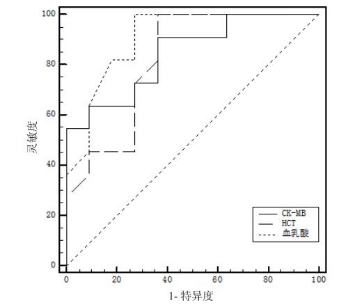 图 1 血乳酸、Hct及CK-MB预测心脏破裂伤术后生存患者住ICU时间延长的ROC曲线 Figure 1 The ROC curves of lactic acid, Hct, and CK-MB for prolonged ICU stay time of cardiac rupture patients after operations |
