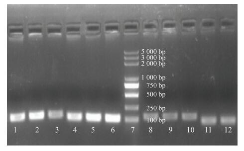 2.4 Real-time PCR产物琼脂糖凝胶电泳产物位于预期位置,进一步确定产物特异性,见图 1。