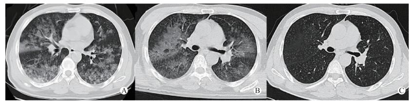 入我科急诊ICU后予继续给予储氧面罩吸氧,氧饱和度仅能维持在90%~92%,RR:35次/min,HR:135次/min; 患者自诉胸闷气急症状不能缓解,呈端坐位呼吸。与家属充分沟通后改为经鼻高流量吸氧治疗:初始吸入氧体积分数70%, 氧流量50 L/min; 同时给予甲强龙80 mg静滴,沐舒坦化痰及雾化吸入等对症治疗,患者氧饱和度逐渐上升至98%~100%,并自诉胸闷气急症状明显缓解,可平卧。使用高流量氧疗1 h后复查血气分析:pH 7.38,PO2 88.4 mmHg,PCO2 23 mmHg, BE-1.36 mmol/L, SB 23.3 mmol/L; 后患者病情逐渐稳定,氧饱和度维持在95%~99%,仍稍有胸闷气急症状,有咳嗽咳痰,痰容易咳出。3 d后复查胸部CT提示(图 1B):两肺斑片影较前吸收,经鼻高流量吸氧治疗模式调整为:吸入氧体积分数40%, 氧流量30 L/min。患者氧饱和度基本维持在96%以上,胸闷气急症状基本消失,仍稍有咳嗽,无咳痰,入监护室5 d后患者病情好转后转入普通病房,改为普通鼻导管吸氧治疗,7 d后再次复查胸部CT提示(图 1C),肺部斑片状影基本吸收,患者无明显不适主诉,予出院并嘱其定期复查胸部CT。