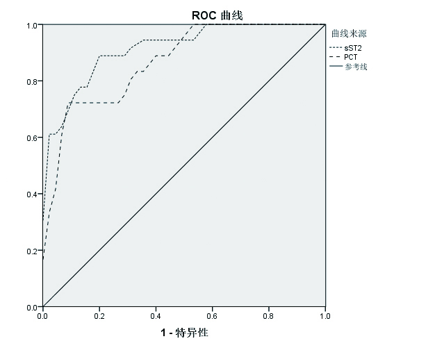 图 1 sST2和PCT的ROC曲线 Figure 1 ROC curve of sST2 and PCT |