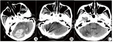 A:术前,小脑出血约19 mL, 小脑实质、脑干受压,脑干周围池显示不清;B:术后1 d, YL-1型颅内血肿穿刺+尿激酶液化术后,小脑出血较前减少;C:术后1月,右侧小脑半球见片状低密度影,脑干环池结构恢复 图 1 女性患者头颅CT片 Figure 1 The CT picture of the female patients |
