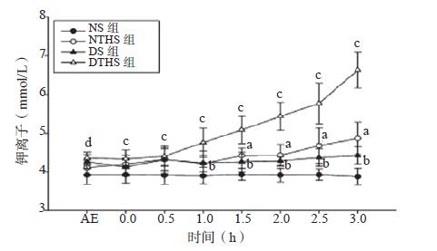 与NS组比较,aP < 0.05;与DTHS组比较,bP < 0.05;与NTHS组比较,cP < 0.05;干热环境组与常温环境组暴露3 h比较,dP < 0.05 图 2 各组血清钾离子浓度变化趋势图 Figure 2 The trend chart of serumpotassium level in each group |