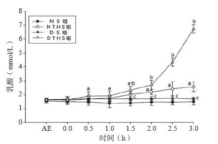 与NS组比较,aP < 0.05;与DTHS组比较,bP < 0.05;与NTHS组比较,cP < 0.05 图 3 各组血清乳酸浓度变化趋势图 Figure 3 The trend chart of serum lactate in each group |
