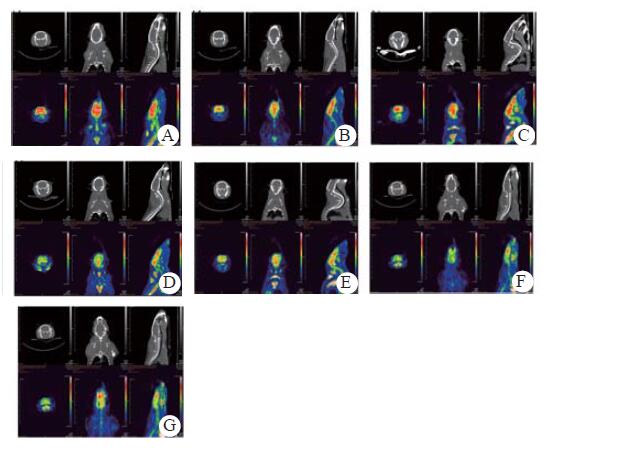 A:sham组;B:CA4组ROSC 24 h;C:CA4组ROSC 72 h;D:CA6组ROSC 24 h;E:CA6组ROSC 72 h;F:CA8组ROSC 24 h;G:CA8组ROSC 72 h 图 2 各组大鼠PET扫描图像 Figure 2 PET scanning images of rats in each group |
