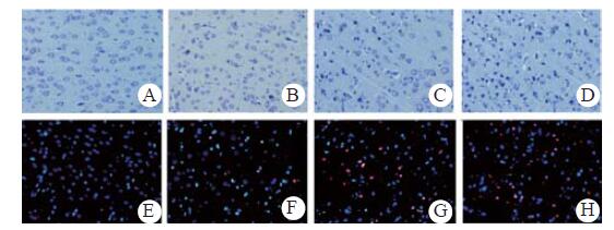 2.4 组织病理损伤及细胞凋亡ROSC后大脑神经元损伤的表现为:胞质深染,尼氏小体消失,胞核固缩。损伤神经元的比例与CA时间长短有关,CA8组高于CA6及CA4组(P < 0.05,图 3A~D和表 1),CA6组高于CA4组(P < 0.05);TUNEL检测的凋亡阳性细胞呈红色荧光, 凋亡指数与CA时间长短有关,CA8组高于CA6及CA4组(P < 0.05,图 3E~H和表 1),CA6组高于CA4组(P < 0.05)。
