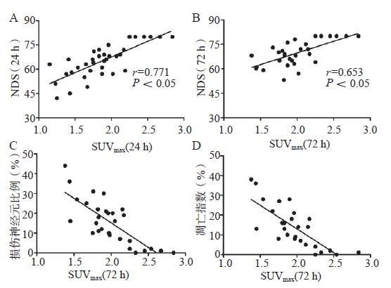 ROSC 24 h和72 h脑SUVmax与NDS均呈显著正相关(r=0.771和r=0.653,P < 0.05);ROSC 72 h脑SUVmax与损伤神经元比例和凋亡指数均呈显著负相关(r=-0.775和r=-0.787, P < 0.05),见图 4。
