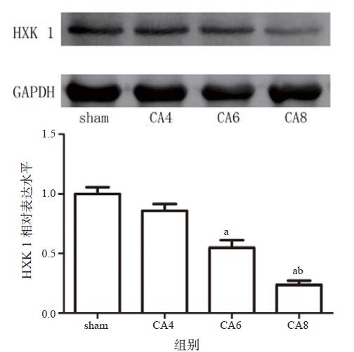 与CA4组比较,aP < 0.05;与CA6组比较,bP < 0.05;n=5 图 5 各组HXK I蛋白的表达 Figure 5 The expression of HXK I of each group |