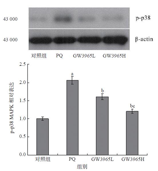 GW3965L:GW3965低剂量处理组;GW3965H: GW3965高剂量处理组;与对照组比较,aP < 0.05;与百草枯染毒组比较,bP < 0.05;与GW3965低剂量组比较,cP < 0.05 图 2 p38 MAPK在肺组织的表达 Figure 2 Expression of p38 MAPK in lung tissue |