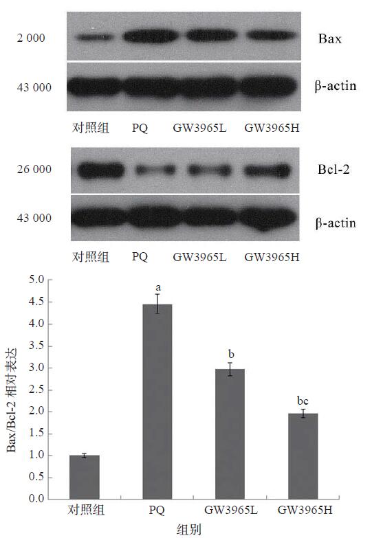 GW3965L:GW3965低剂量处理组;GW3965H:GW3965高剂量处理组;与对照组比较,aP < 0.05;与百草枯染毒组比较,bP < 0.05;与GW3965低剂量组比较,cP < 0.05 图 3 Bax及Bcl-2在肺组织的表达 Figure 3 Expression of Bax and Bcl-2 in lung tissue |